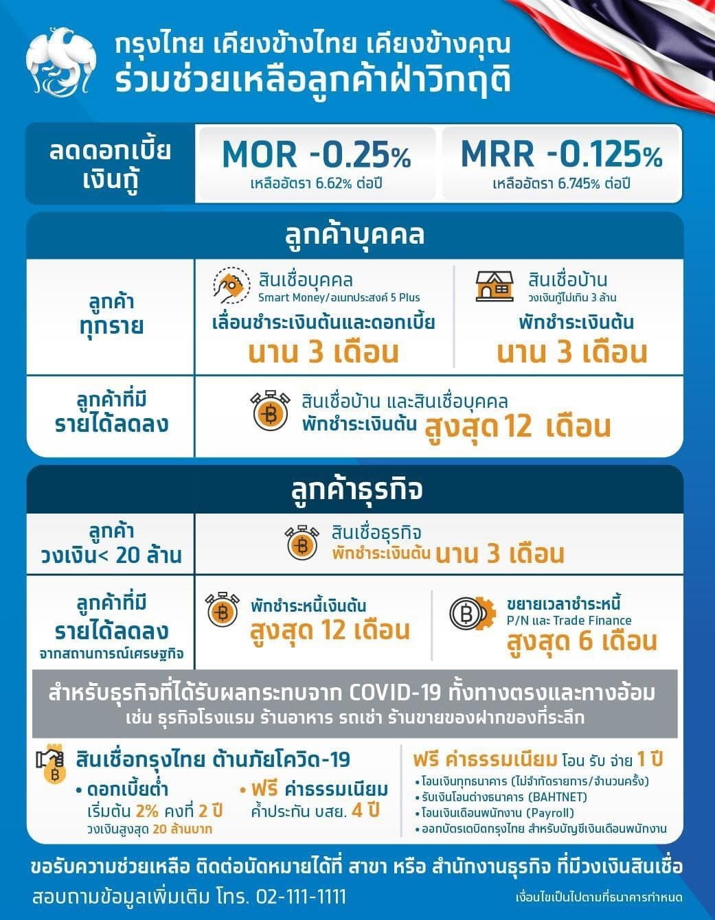 ภายใต้สถานการณ์การแพร่ระบาดของเชื้อไวรัส COVID-19 ได้ก่อให้เกิดผลกระทบในวงกว้าง ทั้งต่อการดำเนินชีวิตของประชาชน และธุรกิจการค้าและบริการในทุกระดับ ธนาคารกรุงไทยได้ตระหนักถึงผลกระทบที่เกิดขึ้น จึงได้ดำเนินมาตรการเพื่อแบ่งเบาภาระทางการเงินแก่ลูกค้าผู้ใช้บริการ เพื่อบรรเทาผลกระทบที่เกิดขึ้น และนำพาลูกค้าทุกกลุ่มฟันฝ่าวิกฤตไวรัสมรณะไปด้วยกัน
