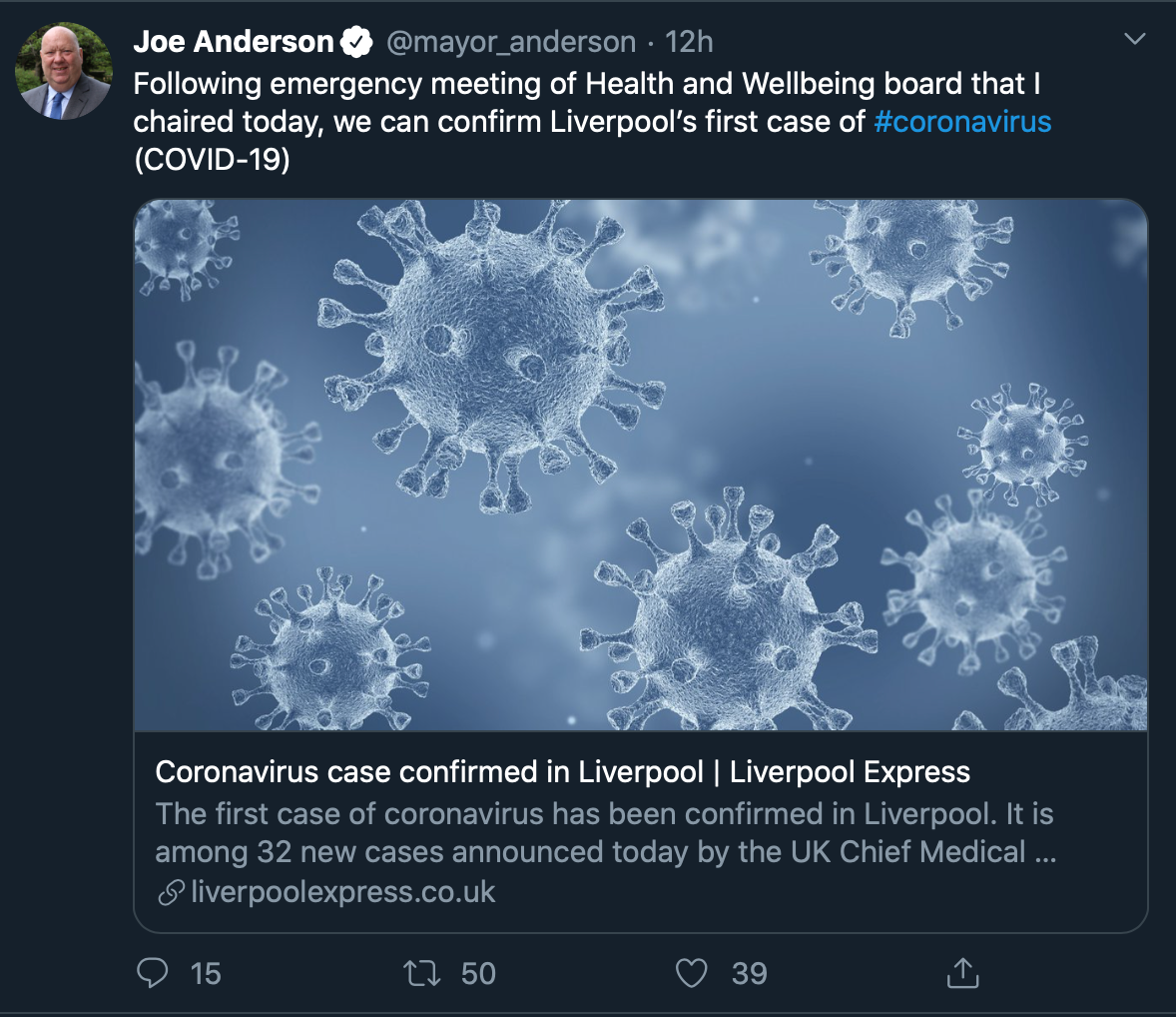 นายกเทศมนตรี ประกาศข่าวร้ายผ่านทางทวิตเตอร์ว่า“หลังจากการประชุมฉุกเฉินกับคณะกรรมการเพื่อสุขภาพและความปลอดภัย ซึ่งผมทำหน้าที่เป็นประธาน ขอยืนยันว่าเมืองลิเวอร์พูลพบผู้ติดเชื้อไวรัสโควิด-19 รายแรกแล้ว” พ่อเมืองลิเวอร์พูล อัพเดทสถานการณ์